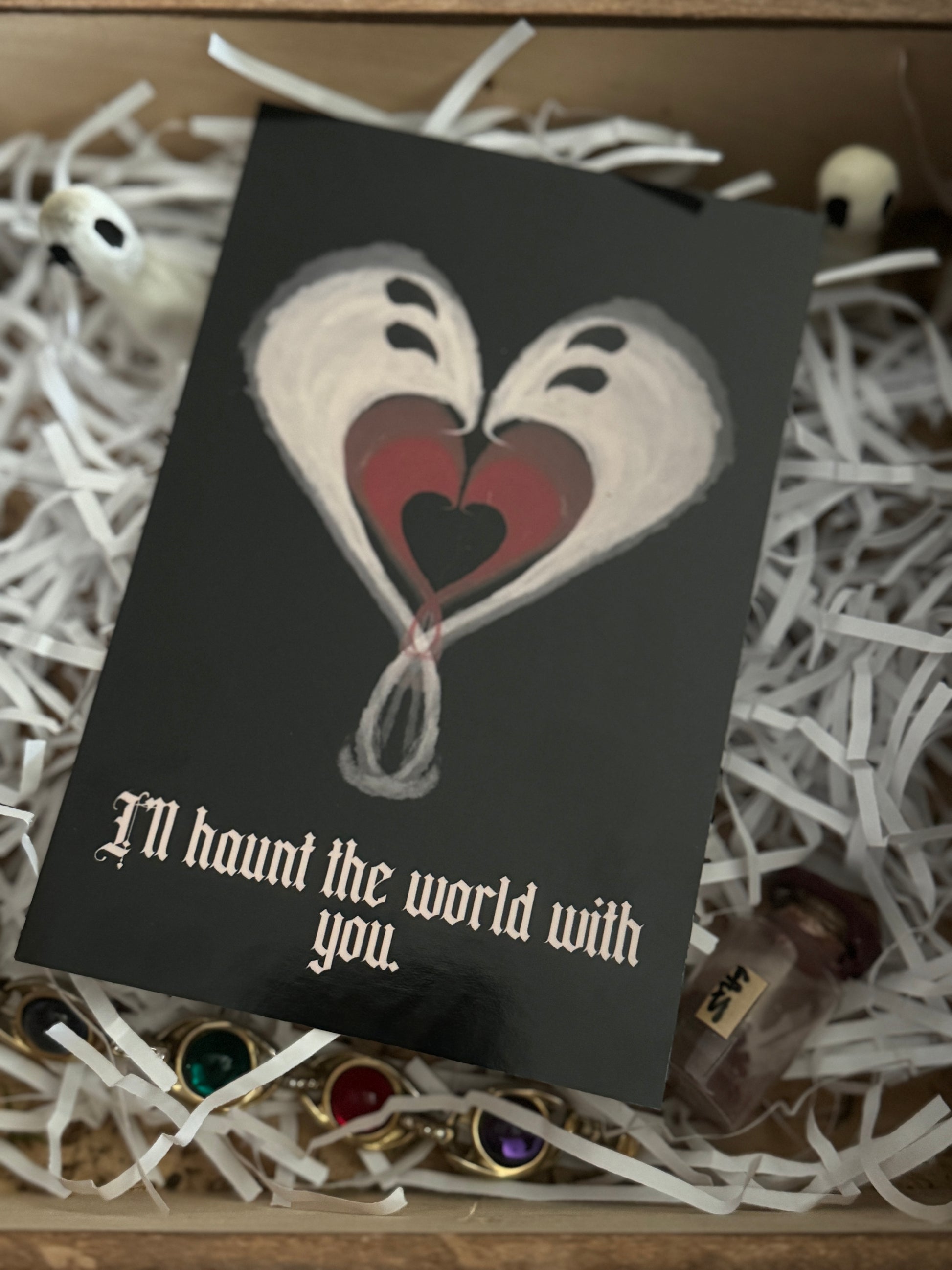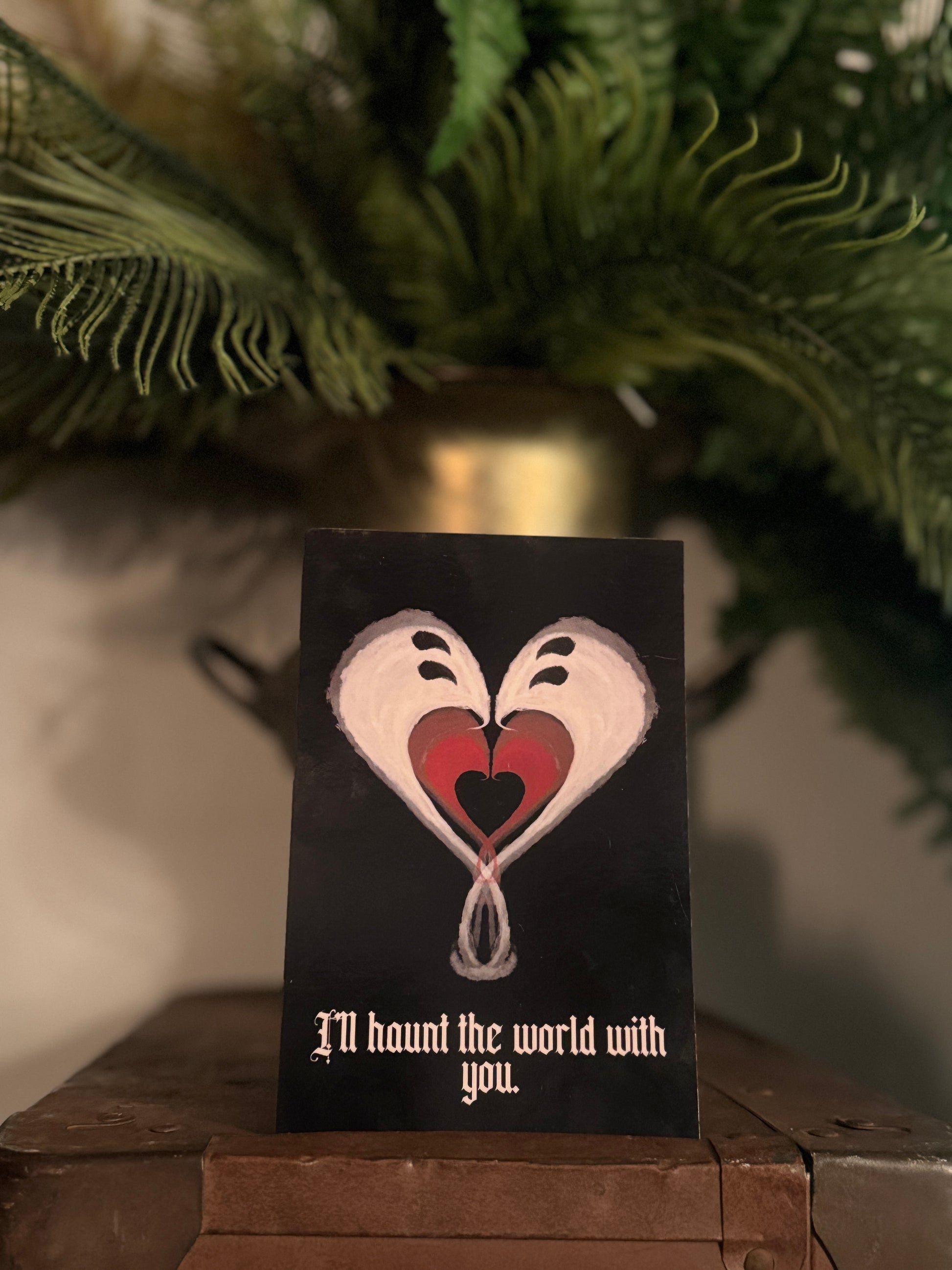 "Haunt the World" 4x6 Print. Express yourself to your Soulmate with this print. Or your person who you love scaring others with. The one who will be by your side in any Haunted House. Spread the spooky love.