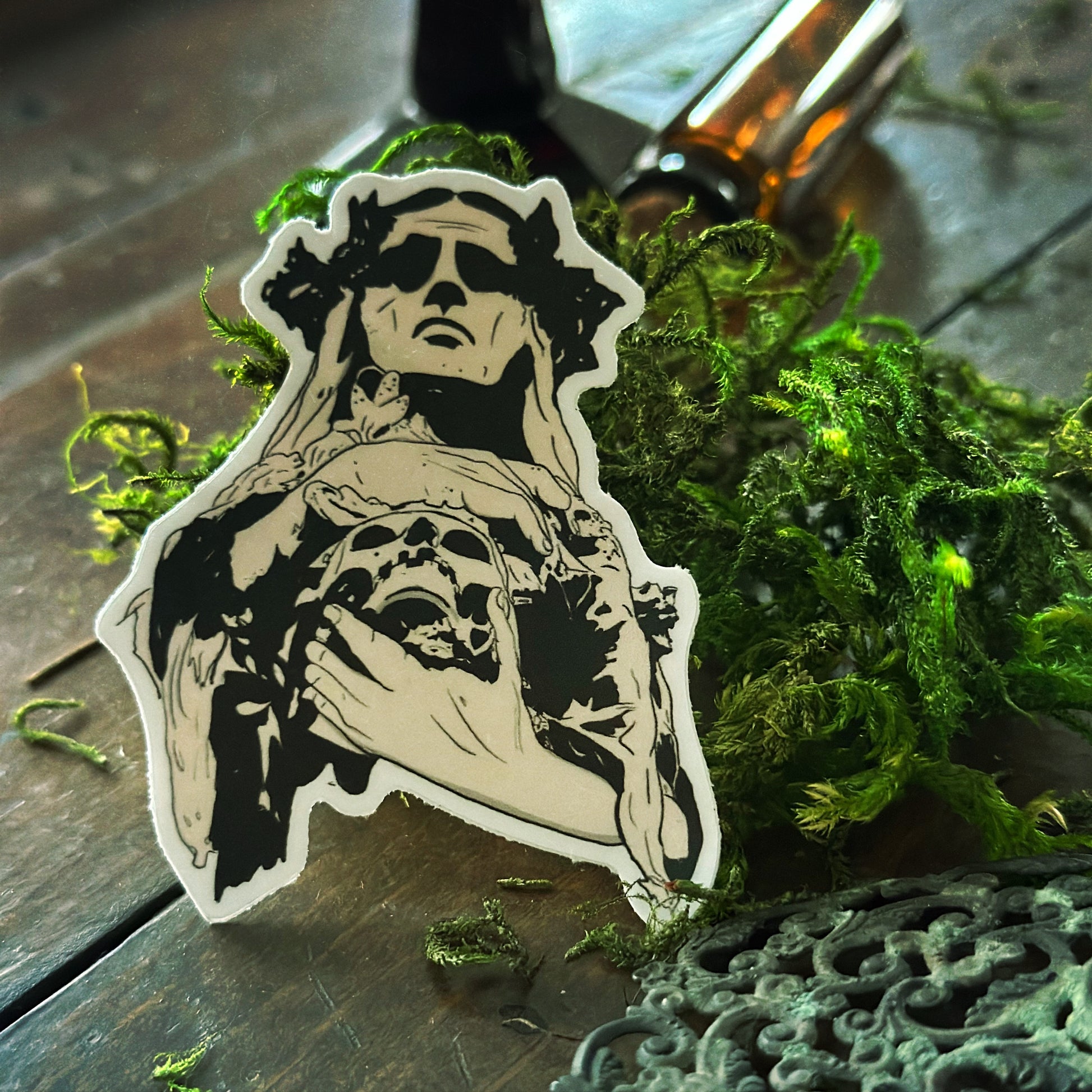 An adhesive homage to one of the many statues that stand within the halls of The Dream Eater Society. Did you know that our statues all keep detailed logs of all the happenings within our halls?